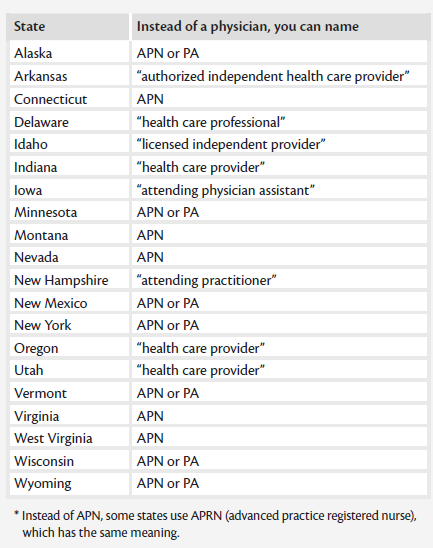 In many states, you can name a non-physician primary provider to oversee your medical care. For example, some states allow you to designate an advanced practice nurse (APN)* or physician's assistant (PA) as your primary care provider. See the chart below. This trend recognizes that the provider who knows you and your condition best may not always be a doctor.